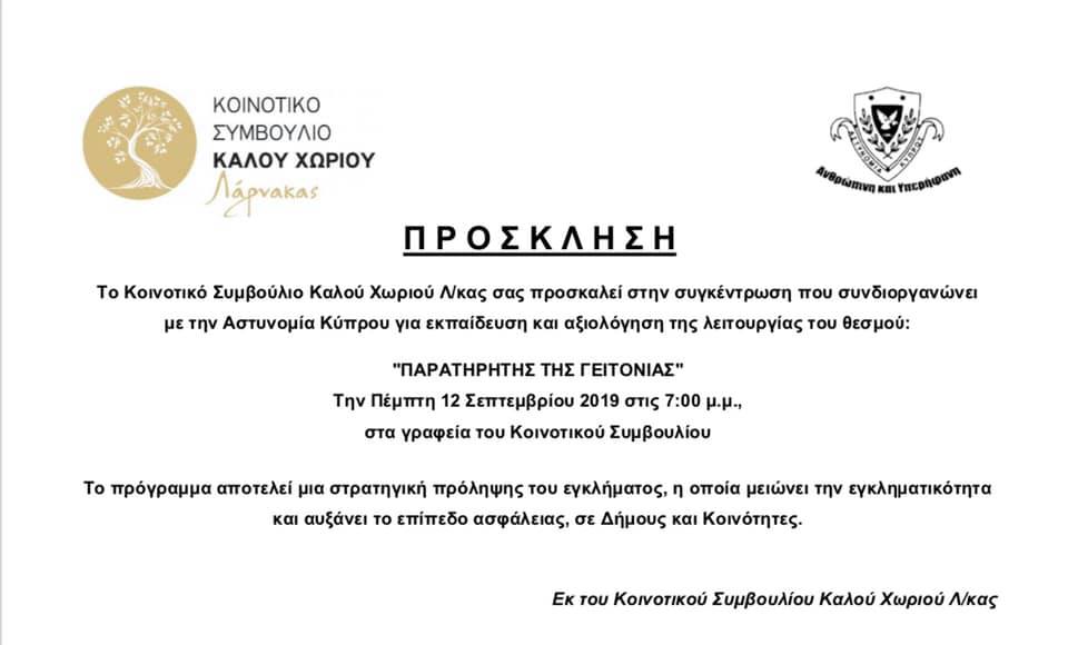 Συγκέντρωση για εκπαίδευση και αξιολόγηση της λειτουργίας του θεσμού «ΠΑΡΑΤΗΡΗΤΗΣ ΤΗΣ ΓΕΙΤΟΝΙΑΣ» 12/9/2019